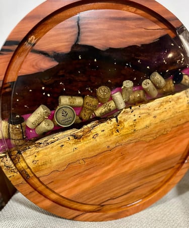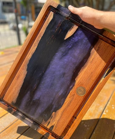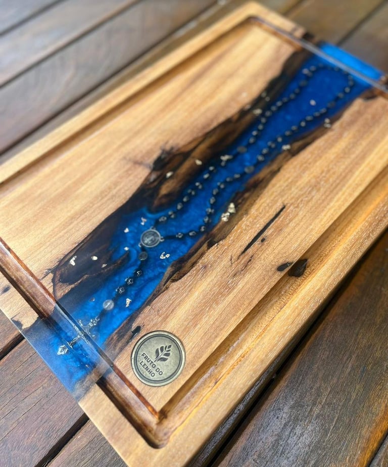 As tábuas de corte em madeira com resina são produzidas a partir de madeiras nobres ou de reflorestamento, combinadas com resina epóxi, criando peças únicas e cheias de personalidade.
