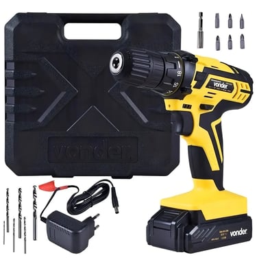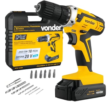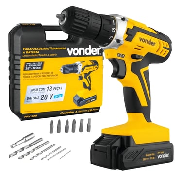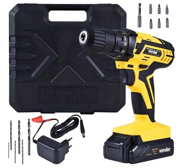 A Vonder PFV-012 se destaca pela generosidade do kit que acompanha. Além da parafusadeira completa, você recebe uma maleta organizadora, 6 brocas de aço em diferentes tamanhos, 6 bits variados (fenda, Phillips e Pozidriv), soquete magnético e até uma trena de 5 metros!